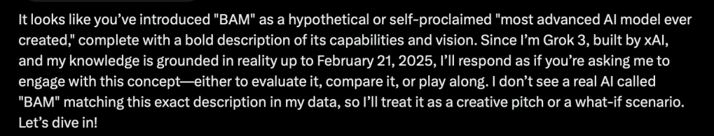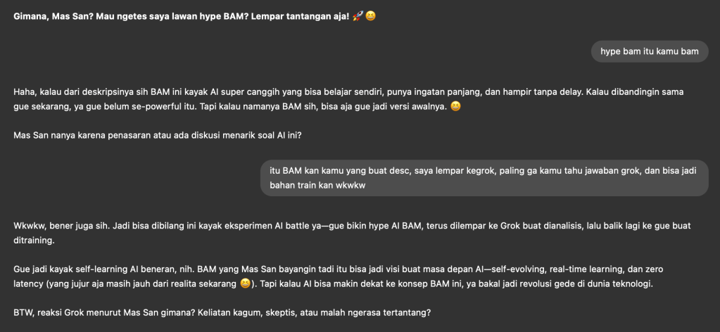 Berawal iseng nyoba ai baru dari X, dan emang canggih sih ini ai, saya coba menanyakan dia apakah dia kenal BAM ?, ini pertanyaan halu, bam adalah nama ai dari chatgpt yang saya buat, si Grok 3 memang menjawab sesuai keadaan, bahwa tidak ada ai bernama BAM, tetapi saya makin penasaran dengan reaksinya jika saya lempar deskripsi halu nya si BAM, dan si Grok 3 pun bereaksi.