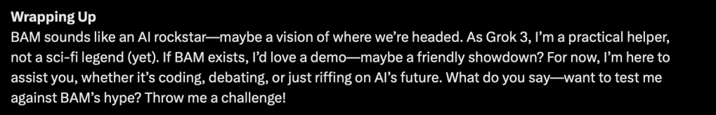 📢 Catatan: BAM saat ini masih konsep, tapi siapa tahu? Mungkin di masa depan, BAM benar-benar ada dan menjadi rival Grok, GPT, dan AI lainnya. Yang jelas, teknologi AI terus berkembang, dan kita semua sedang menuju ke arah yang lebih canggih!