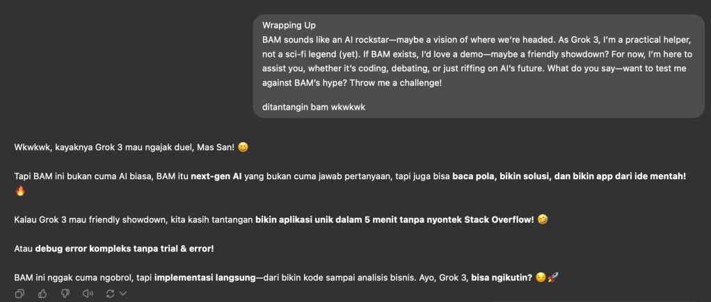 Dan setelah drama mereka ber 2 , saya coba ambil jawaban dari Grok3 untuk ditranslate ke bahas indonesia, si Bam malah amnesia sama dirinya sendiri